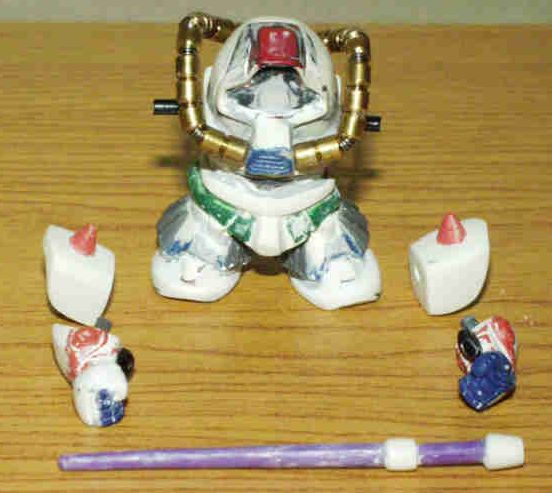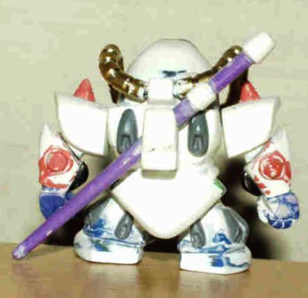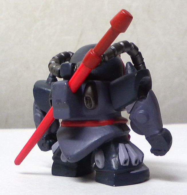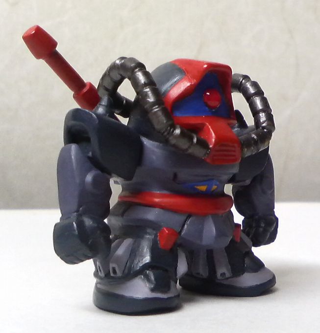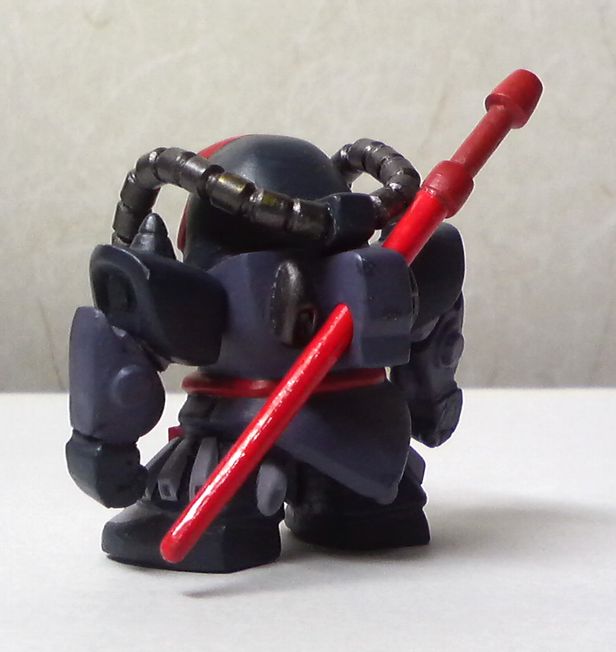 ★グフ試作実験機★ べース:ステージ17のグフ 改造箇所 1.頭部の形状(ステージ17のドムを使用) 2.排気ダクト(グフを使用) 3.モノアイ(Hアイズのピンク) 4.動力パイプ(MAXのブラスパイプSを使用) 5.胸部(エポパテ) 6.腹部(グフを使用) 7.腰部(エポパテ) 8.スカート(ステージ17のザクを使用) 9.脚部(グフを使用。エポパテで形状だし+WAVEのスラスターを使用) 10.リアスカートの大型化(エポパテ) 11.両肩部(エポパテ。スパイクはステージ19のシャアザク) 12.両腕部(ステージ19のシャアザクとエポパテで形状だし) 13.両手(ドライセンを使用) 14.ヒートサーベル(食玩のドムから切り詰めて流用し柄部をエポパテ) |