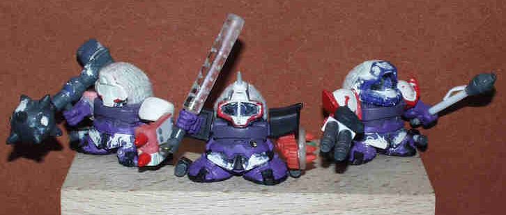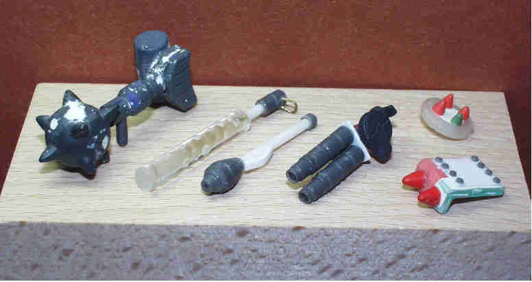 写真左上より ・ハンマーバズーカー(山越えハンマー) ・電磁こん棒 ・シュツルムファースト ・ダブルマシンガン ・丸型シールド ・ザクシールド