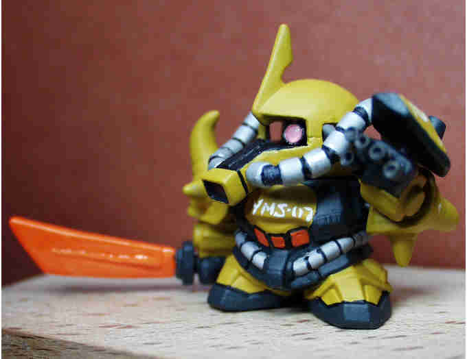 別アングル2 マーキングも初挑戦です。 胸部に白字で「YMS-07」と書き込んで見ました。 もちろん細筆を用いてフリーハンドです。 難しいケド今後も出来そうな気も・・・。 |
