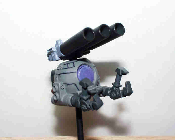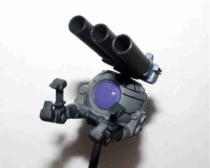 別アングル1 3連キャノン砲は、金属製品なので、塗装する前に メタルプライマーで下地処理しています。 塗装は 本体:ニュートラルグレー+ブラック少量 キャノン砲:メタルブラック マニピュレーター・バックパック:タイヤブラック コクピット:ホワイト+パープル バックパックのバーニアー:カッパ 最後にトップコート(つや消し)を吹いています。 |