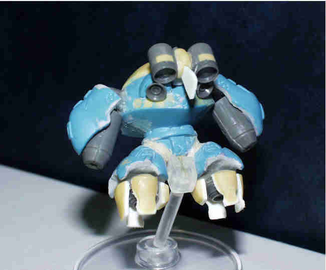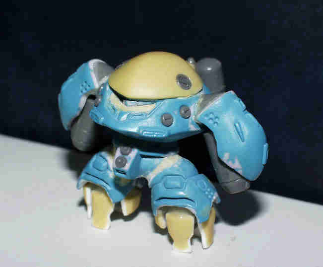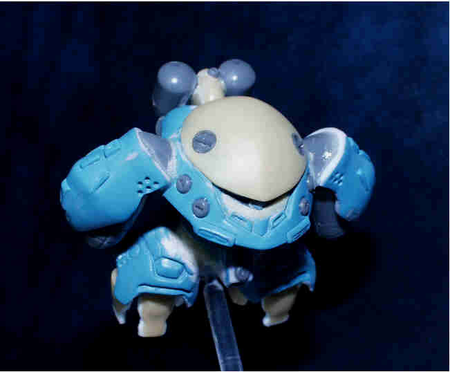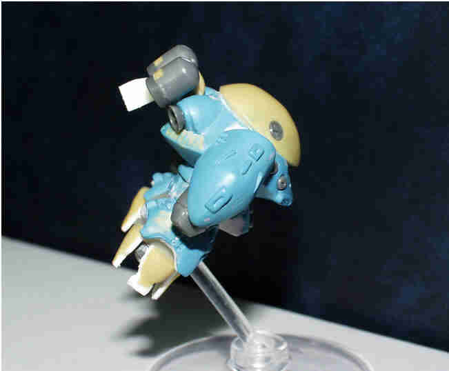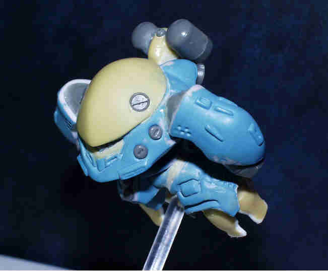 塗装前の状態 ベースはステージ18のハイゴッグです。 頭部:エポパテで形状を変更し、やや大型化。 モノアイ:モノアイレールの形状をエポパテで修正。 両肩:ハンドミサイルを持たせるために内部をくりぬいて あります。 ハンドミサイル:市販パーツをベースに一部改良。 バックパック:市販パーツの組合せ。 脚部:脚部は一旦胴体から切り離し、直立になるように 再接着。足の甲はプラ板とエポパテでスクラッチ。 モールドは市販パーツを使用して各パーツを ディティールUP。 |