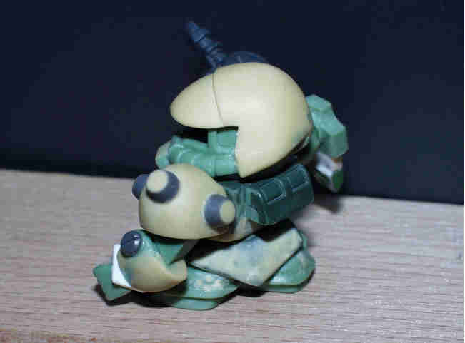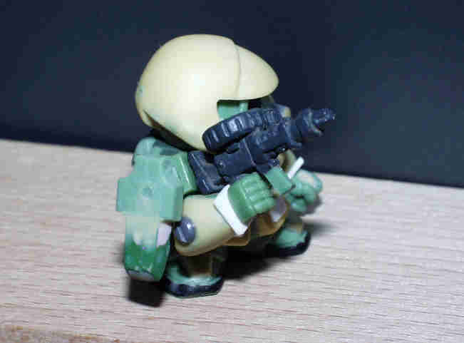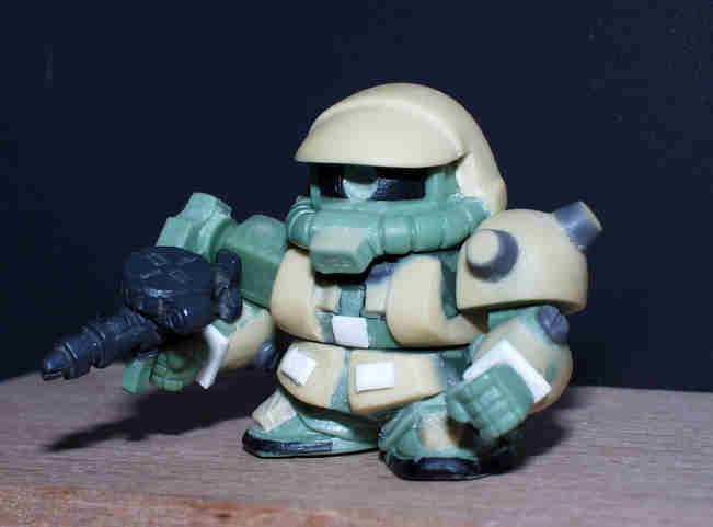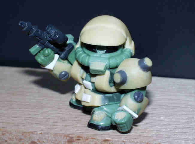 ベースはステージ41の量産型ザクUです。 黄色に見える個所がポリパテによる整形個所です。 SDFCの形状を生かして改造しました。 最近のSDFCは各パーツが分割されているので 改造や色塗りが大変やり易くGOODですね。 |