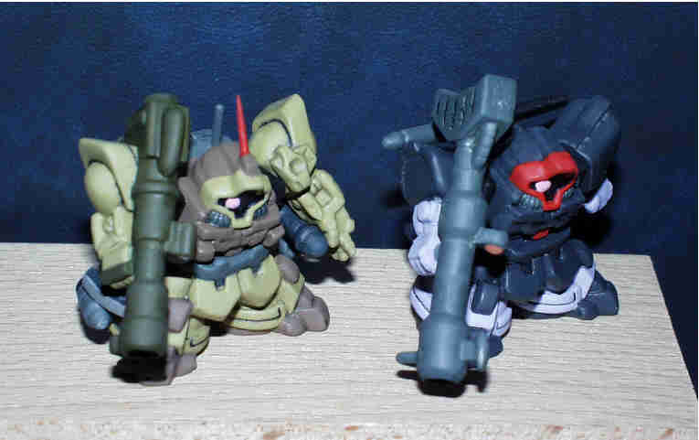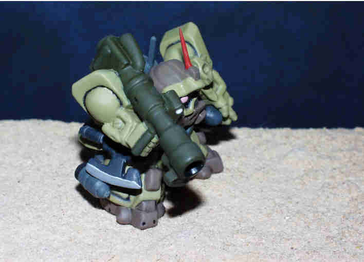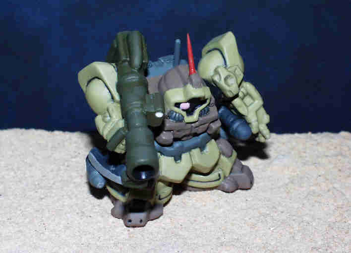 ベース:写真左のデストロイヤードム 改造個所:頭部、両肩の突起を切除。 前面、後面スカートの突起を切除。 頭部には識別用アンテナを設置。 ランドセルには通信アンテナと カセット式燃料タンクを設置。 とお手軽改造です。 バズーカーの銃口はピンバイスで穴あけを 施してあります。 |