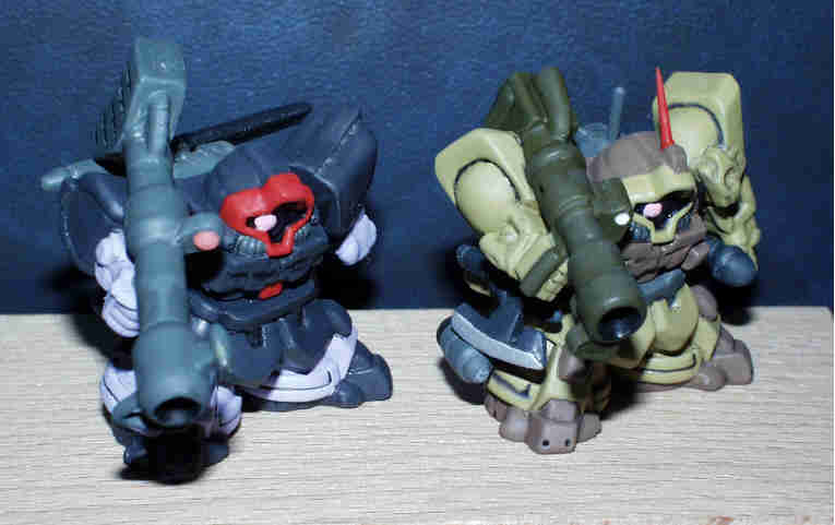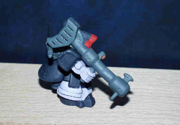ベース:写真左のデストロイヤードム 改造個所:頭部、両肩の突起を切除。 前面、後面スカートの突起を切除。 両肩、両腕ステージ46のリックドム とお手軽改造です。 ジャイアントバズーカーの銃口はピンバイスで 穴あけを施してあります。 |