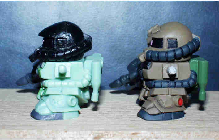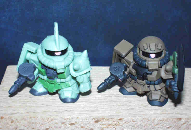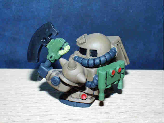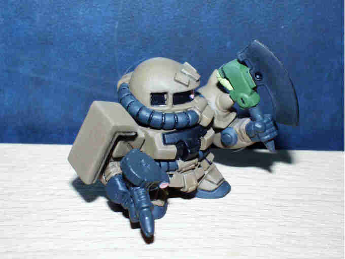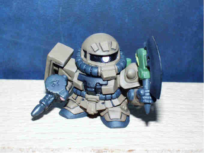 デザートカラーのザクF2 ベースとなる彩色は、 肌色を基本に、サンドイエロー+ウッドブラウン+オリーブドラブ+ ブラックを混在させて作ってあります。 モノアイはピンク。モノアイレールとコクピットはブラック。 動力パイプ、手足等はタイヤブラック、 ランドセルはフィールドクリーンをそのまま使用してあります。 最後にトップコート(つや消し)を吹き付けて完成です。 |
