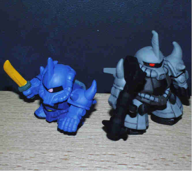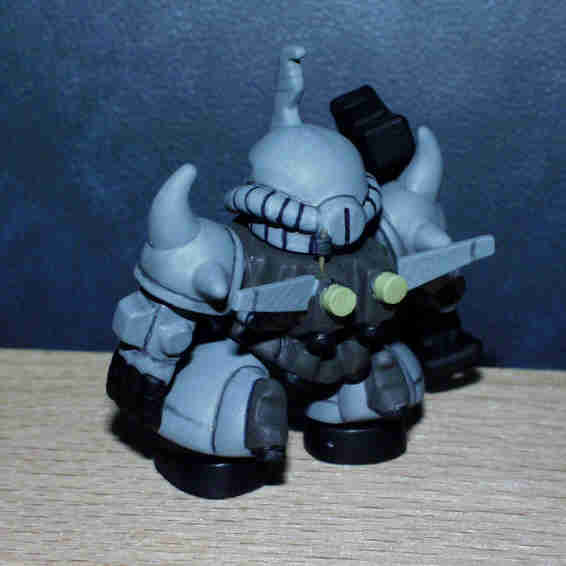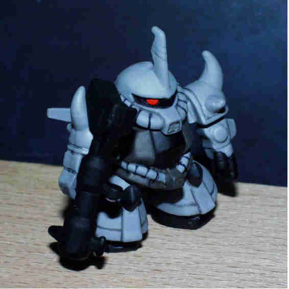ベース:写真左ステージ28のグフ(両腕のみ) 胴体はステージ26のグフ。 頭部は、SDガンダムフォースの グラップラーグフ。 脚部はステージ31のドム。 足の甲はフルスクラッチ。 |
