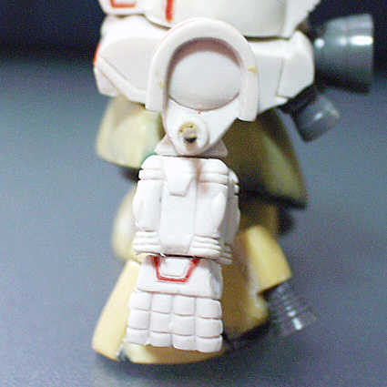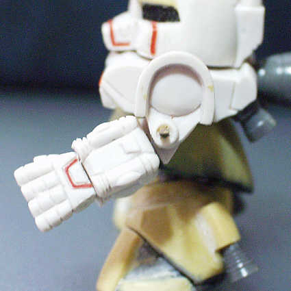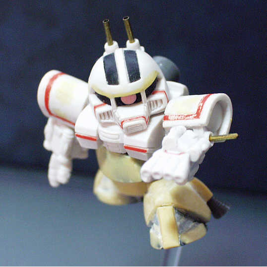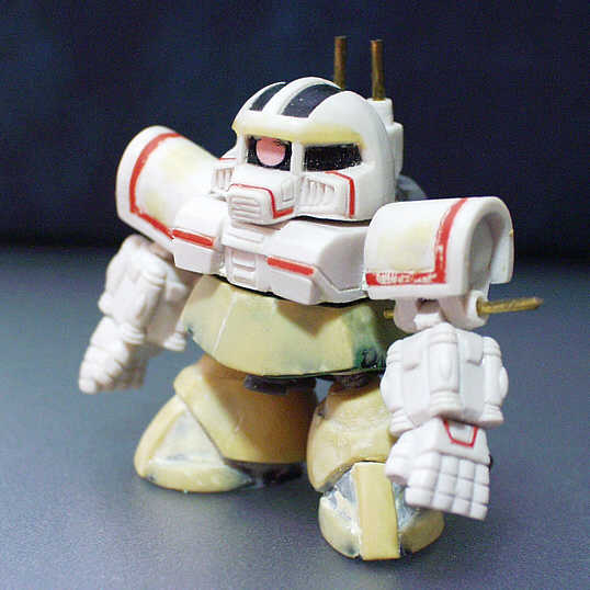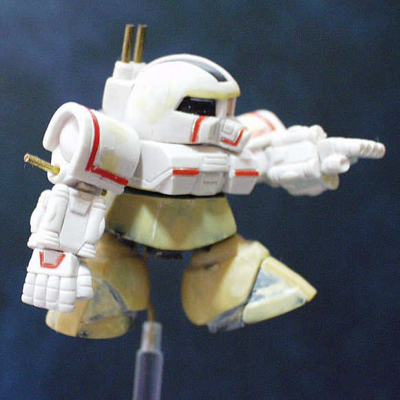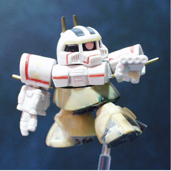 ベース ・頭部・両腕・上半身 ステージ51のサイコミュ高機動試験用ザク ・スカート ステージ32のドム ・脚部 ステージ47の量産型ゲルググ 今回新たに試みた改造点は、肘関節の可動です。 詳細はページ下へ。 |