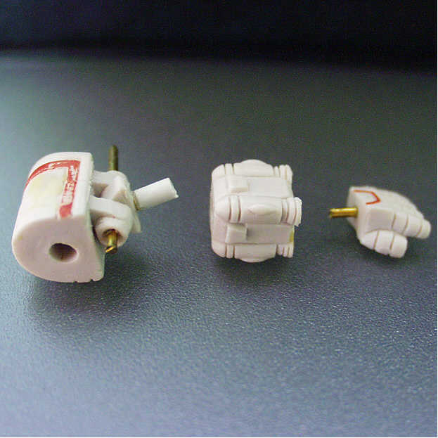 両肘の可動状況及びそのパーツ。 関節パーツ自体もステージ51のサイコミュ 高機動試験用ザクからの流用です。 ・写真上 真ちゅう線が通っている点が中心となるように、 切り取る。 腕へ差込みする凸部も切り取られますが、 再度用いるので無くさないようにする。 ・写真左 関節用パーツ(矢印のようなパーツ)は縦に 切り込みを入れて三角形のパーツを作り出し、 180°反転させて関節パーツとなるようにして います。 腕へ差込みする凸部を再度接着させますが、 補強のために0.5mmの真ちゅう線を中心に 通してあります。左右で太さが違うので、 肩パーツへ取り付ける際には気をつけよう。 なお、肘の可動が後ろへいかないように、 関節パーツの三角形を非対称にしてあります。 |