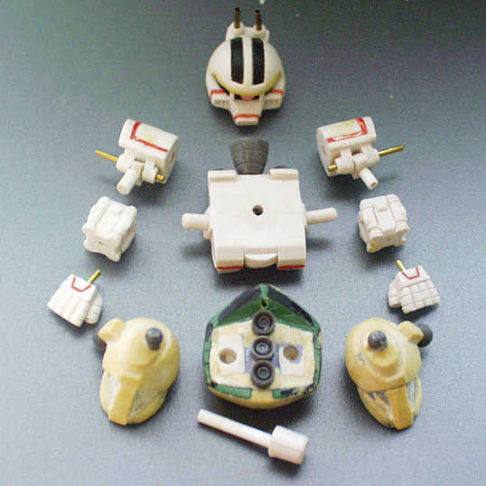 全パーツの状況 頭部、腰の可動は、写真下の軸パーツで 一体化させて再現してあります。 |