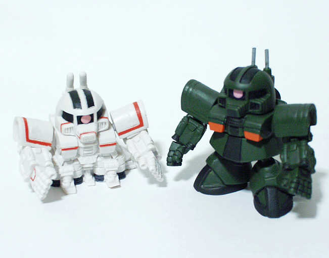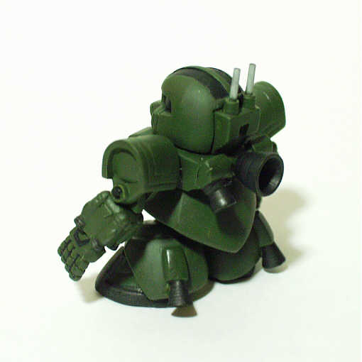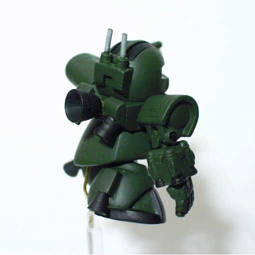 ベース:写真左ステージ51のサイコミュ高機動型ザク ・頭部・両腕・上半身 ステージ51のサイコミュ高機動試験用ザク ・スカート ステージ32のドム ・脚部 ステージ47の量産型ゲルググ 今回新たに試みた改造点は、肘関節の可動です。 塗装 ・頭部、胴体、脚部のメインカラー 暗緑色60%+機体内部色30%+ホワイト10% ・足の甲・バーニア 黒鉄色 |