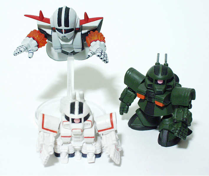 <ビショップ計画> (設定資料より抜粋) ジオン軍は、ニュータイプの持つ脳波誘導の特性 を兵器として活用すべく研究を進めていた。これら のデータ収集とビーム兵器のテストとして3機種の 母機が用意された。中型戦闘機、MAN-03ブラウ・ ブロとMS-06Zである。 ビーム兵器の小型化に遅れをとったMS-06Zが完 成したのは、ブラウ・ブロより10日後の事であった。 試作された3機は実験艦レムリアに搭載され、コレ ヒドールへと運ばれて稼動試験などが行われた。 MS-06Z(左写真の右)の3機内の2号機は、脚部 を大ロケットエンジンに改修が加えられた。これが 左写真下のステージ51で登場したMSN-01サイコミュ 高機動試験用ザクである(商品化に多謝)。 ビショップ計画として期待を背負ったMS-06Zの 2機とMSN-01は貴重なデータ収集を得ることができ、 左写真上のMSN-02ジオングを完成させるに至った のである。なお、MSN-01サイコミュ高機動試験用ザク とMS-06Z-1及びMS-06Z-3はア・バオア・クーへ と移され、戦闘参加した記録が残っている。 |