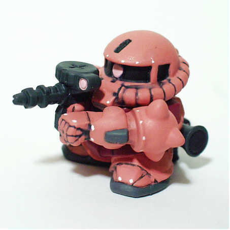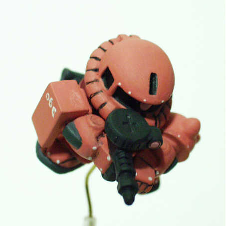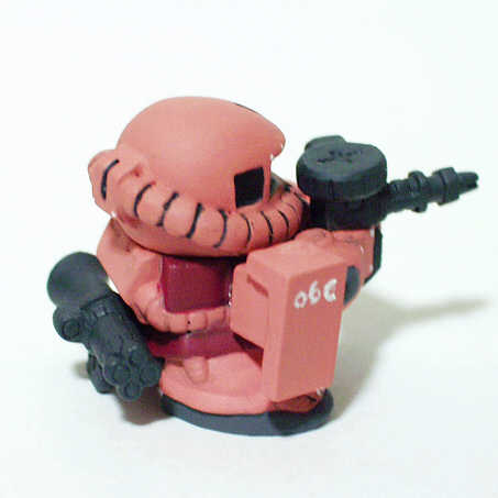 ベース:写真左ステージ56の量産型ザクU 改造個所は頭部に凹部を設けただけです。 塗装 ・頭部、両腕、脚部など ピンク80%+RLM23レッド20% ・胸部 ガンダムカラーシャア専用ザクUFGのレッド2 ・肘、足裏 ガンダムカラーシャア専用ザクUFGの ファントムグレー ・ザクマシンガン、ザクバズーカ ネービーブルー |