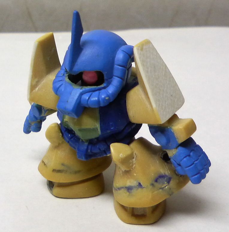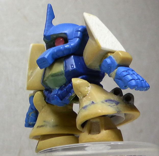 ●組み立て完成 右手の5連マシンガンは、左手を使用。親指の位置 を変更し、右手となるよう指の長さを1mm以下で調整。 背部は、設定資料が見当たらない。基本はH1型と 思われるが・・・ よって背部はパテ盛りしただけで、未制作。。。 **************************************** グフ飛行試験型はH1、H8、H2と今機のH4型を含め て、改造作品として4機めである。 設定資料によれば、MS-07H型は、H1、H2、H3、 H4の4機存在する。 H1型は標準機、H2型は背部にドロップタンクを付け 飛行時間を向上させた機体。H3は不明。H4型は、大 幅に改良を施した機体。 H4型は、両肩を有翼型に形状変更(改造済)、腰に 可動のベントラルフィンの設置(未制作)、脚部のエン ジン換装(改造済。VEファンは未制作) |