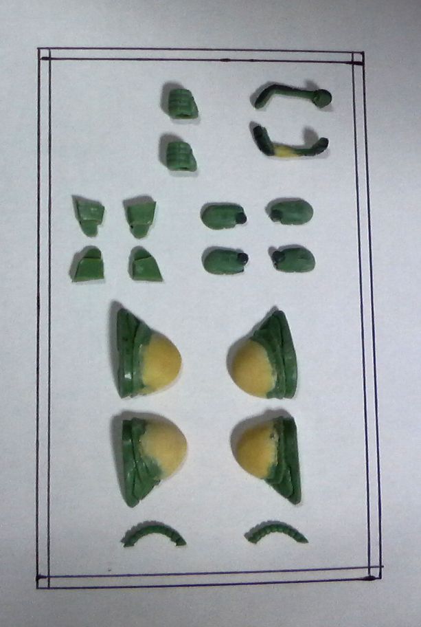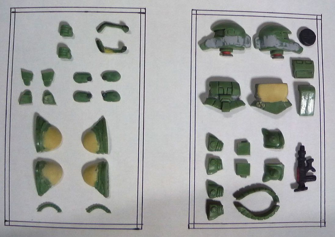 | SDFCもプラモデルのように仕立ててみた。 1/144スケールの量産型ザクUの塗装図を参考 に各パーツに分けた。分解されているものを組立て る場合の逆。出来ているものを分解した。 |