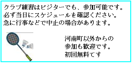 問い合わせ先 kawachi-bad@hotmail.co.jp  初心者の方も参加連絡下さい。体験初回1回無料