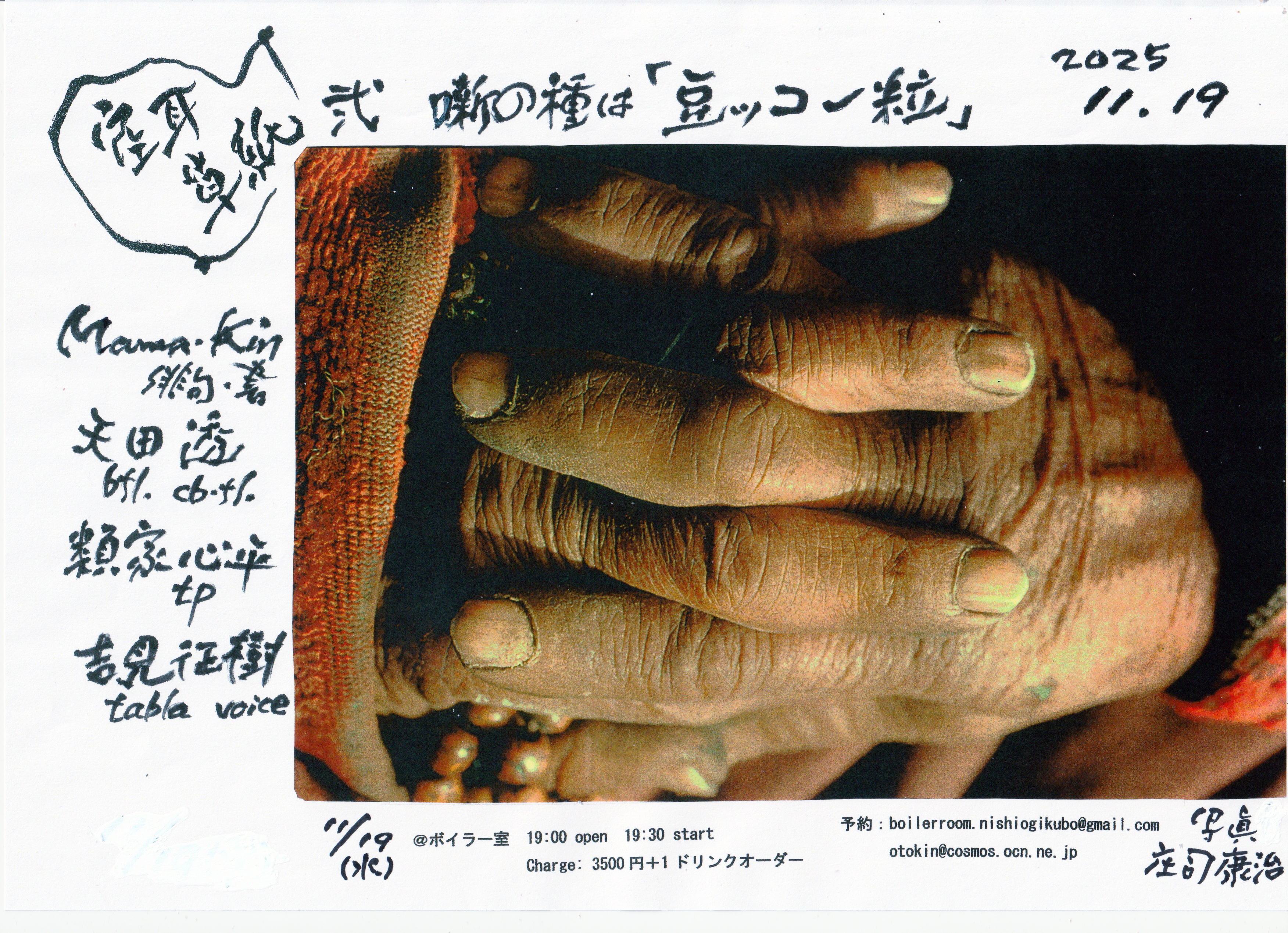 「空耳草紙」 弐 11月19日(水)@ボイラー室 19:00 open 19:30 start charge:3500 1drink order Mama-Kin(俳句・書) 天田透(bfl,cbfl) 類家心平(tp) 吉見征樹(tabla,voice)