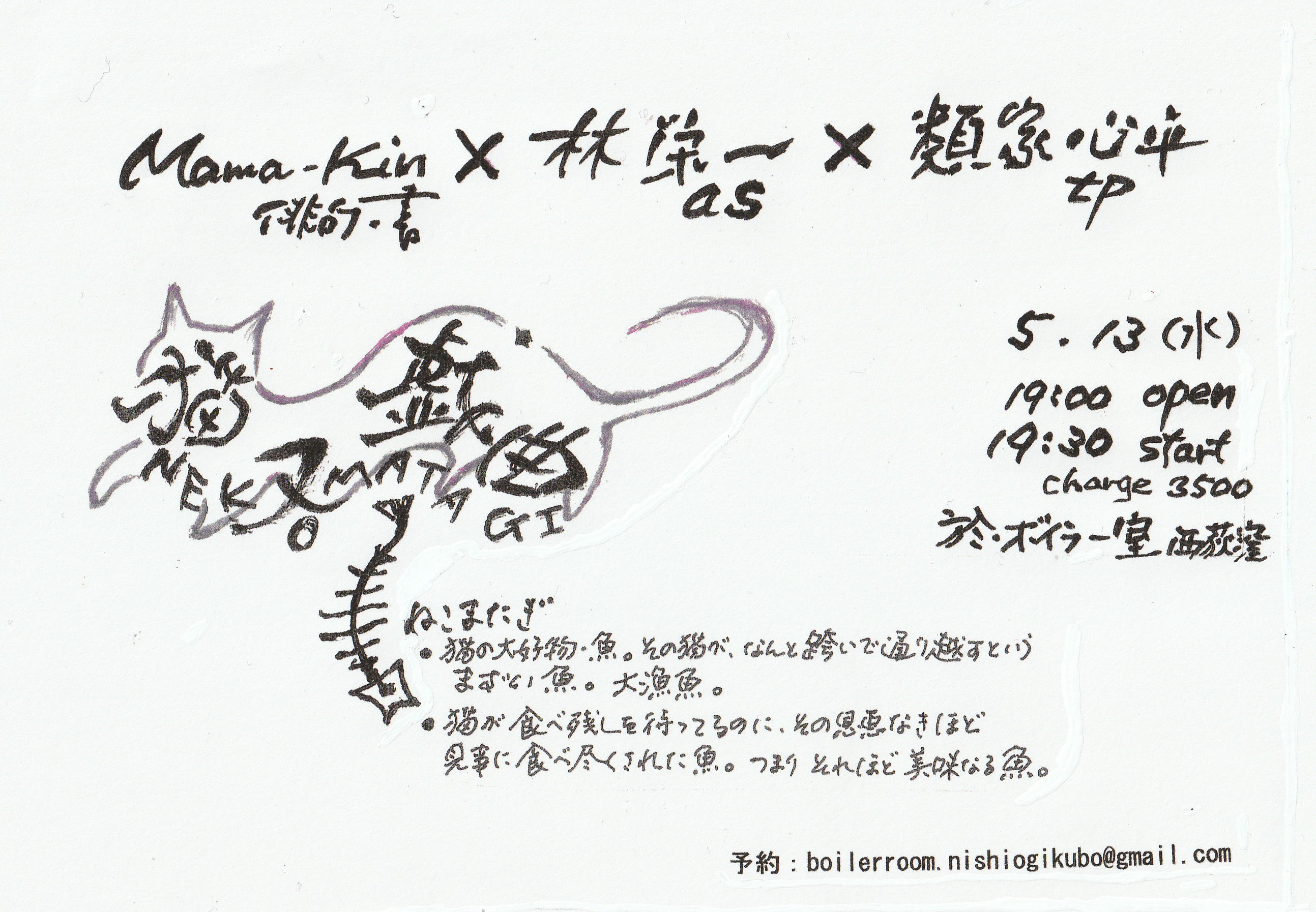 5月13日(水) 猫又戯曲 Mama-Kin(俳句・書)林栄一(as) 類家心平(tp)