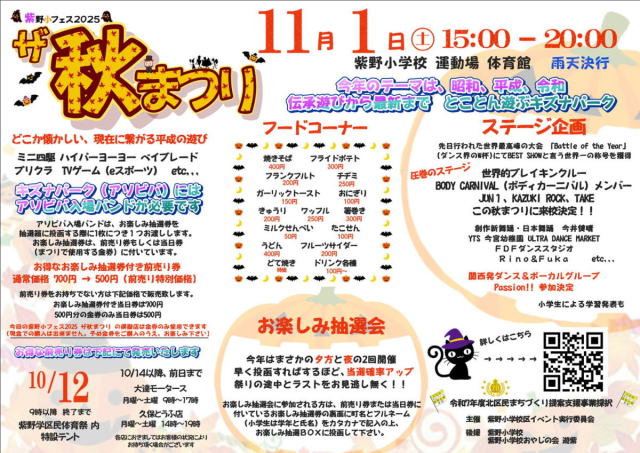 | 主 催:紫野小学校区イベント委員会 日 時:2025年11月1日(土) 場 所:紫野小学校 担当コ−ナー:飲み物コ−ナー 担当団体:紫野交通対策協議会、紫野民生児童委員協議会 |