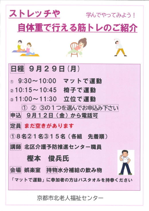 立位運動の内容 ラダーという縄ばしごのようなものを敷き、昔遊んだケンケンパのような感じで、いろいろなステップを踏んでその上を進んでもらいます。 足の反応を高め、転倒予防の効果や考えながら動かすため、認知面の刺激に期待ができます。 参加者同士で自然と教えあったりするので会話も弾みます。 椅子に座って休憩も可能です。 ぜひご一緒に楽しみませんか マット運動の内容 日ごろ北老センハッスルマッスルで取り組んでいるマット運動を30分にまとめてお届けします。 骨盤周辺の体操に焦点を絞り、日ごろ動かす機会が少ない場所を行います。 ご興味ある方は1度お試しにご参加お待ちしています。 説明文:京都市北老人福祉センター |
