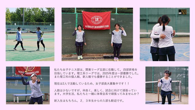 本ページは東京理科大学硬式庭球部女子部の現役の活動をお伝えします。質問・問い合わせ等は"tus_tennis_team@yahoo.co.jp"までご連絡下さい