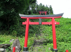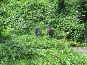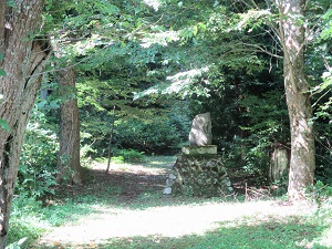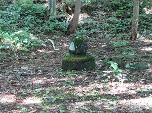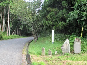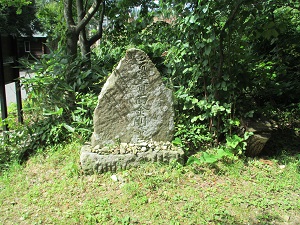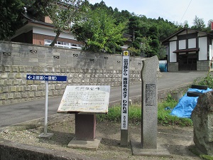旧道は、中山宿跡の説明板のところから国道と分かれ、集落の間を抜けて山中に入る。その際(きわ)に、幕末の大肝入遊佐甚之丞が平左衛門の得を偲んで建てたという遊佐大明神碑と岩渕地区の人々が建てた岩渕大明神碑が見られる。
