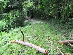 思っていたより広くゆったりした山道だが、先日の台風の影響か、倒木が道をふさいでいたり、ところどころぬかるんでいたりする。