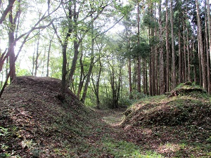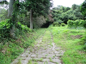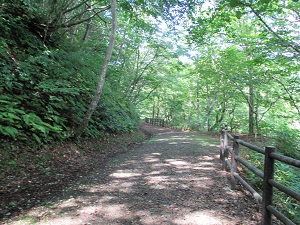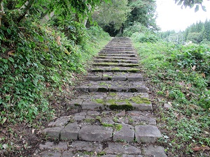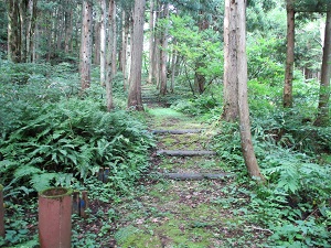鳥居のところに戻ると、そこからさらに“歴史の道”は狼塚の方に向かって続いている。この先も、“歴史の道”を行きたいところではあるが、この上さらに熊出没の心配をし続けて歩くのもためらいがあるため、ここから先は、比較的安心して歩ける県道で岩出山に向かうことにする。