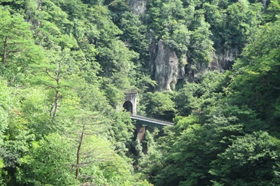 たまたま、観光客の人が近寄ってきて、あと5分すると遠くにわずかに見えるトンネルを電車が通過する、と教えてくれた。折角なのでしばらく待っていると、観光パンフレットなどに紹介されているカットを、ほんの一瞬のことだったが撮ることができた。紅葉の時期に来たら、間違いなく絶景が楽しめると実感する。
