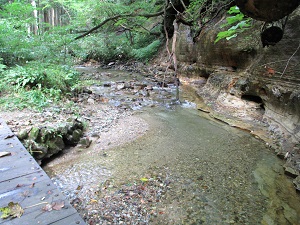 木々の間から明るい陽が漏れる遊歩道を行くと、右側の遥か下の方から大深沢の清流のせせらぎが聞こえて来て、すこぶる心地よく歩けるところである。