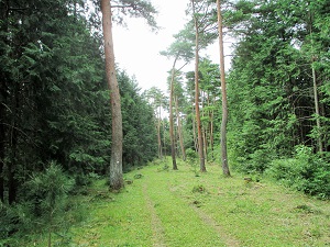 一旦、農道に出て右に進むと、150mほど先で道が大きく右に曲がる手前、道の左側に草生した道が続いているような感じがした。一見これが祠堂ヶ森の古道かと少し不安になるが、入ってみると10m程行ったところに「奥州上街道」の標識が立っている。どうやら、古道に間違いないが、ここも倒木が道をふさいでいたり、ところどころぬかるんでいたりする。