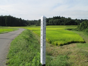 真坂宿を出た街道は再び県道17号線に合流し、やがて県道59号線を左に分岐して、岩出山に向かって南下する。分岐してすぐ右手の沼のほとりに水神社の説明板が立っている。雨乞いの神として信仰された神社で、11世紀にはすでに祠堂があったという古い歴史をもつらしいが、あたりに神社らしきものは見当たらず。