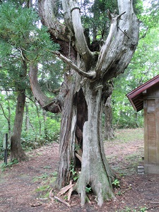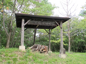 山刀伐峠の頂上には東屋が建ち、そこから月山や朝日連邦を一望することができるらしいが、曇っていてよく見えなかった。東屋の近くには、山刀伐峠越の碑や子宝地蔵尊、子持ち杉が見られる。