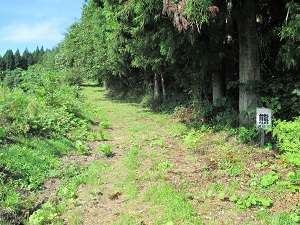 やがて祠堂ヶ森を抜けて、広域農道大又-割山線に出る。古道の出口には「奥州上街道」、「奥の細道 祠堂ヶ森」の標柱が設けられている。