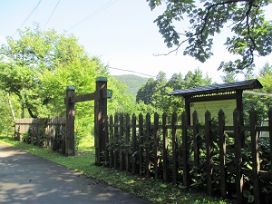 いかにも古道らしい趣のある道を下ってゆくと、関所を模した門と柵が見えてくる。