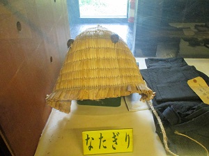 山刀伐峠の名は、刀を持った追い剥ぎがこの辺に出没したことからそう呼ばれるようになったという説や、民具「なたぎり」にちなんでいるという説が知られている。なたぎりとは野良仕事用の藁製作業帽で、一方が急で一方がなだらかなその地形を、なたぎりの形にたとえたわけである。たまたまそのなたぎりが、前日立ち寄った邦人の家の展示品の中にあった。