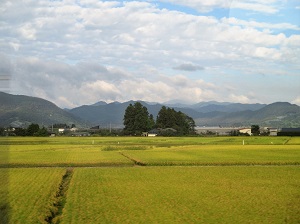 大石田からの奥羽本線・山形新幹線は、天童辺りまで、芭蕉が山寺に向かった羽州街道におおむね並行している。車窓からの景色は、のどかな田園風景が続いている。