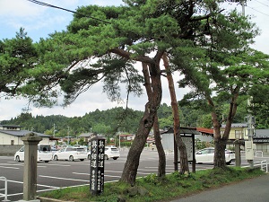 八日町の変則十字路の右手には、「奥の細道 岩ケ崎鶴丸城跡」の説明板と名残の松が立っている。城址は栗駒小学校の北側の山にあり、ここは城址には立ち寄らず、先を急ぐ。