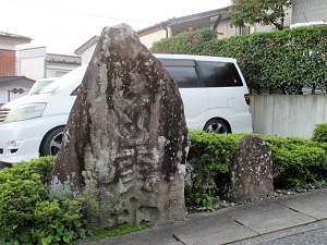 一迫川を渡り、すぐ先で長崎川を越えて真坂の街中を進んで行くと、街はずれの南町の秋葉神社に芭蕉の時雨塚がある。