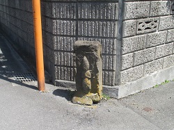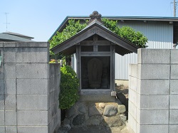 豊受大神を出て街道に戻ると、道路向う側の石垣が組まれた旧家の塀の片隅に地蔵祠と道祖神が見える。
