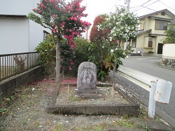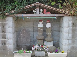 最初の交差点で右に行くのが旧道だが、ちょっと左に行くと民家の塀のしっかりした囲いの中にお地蔵さまが鎮座していた。もとに戻って旧道の方に進むと、すぐ先の三叉路には愛鶏供養塔と地蔵2体が塀にしっかり囲われて置かれていた。