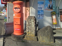 伊勢原大神宮を出て国道を10分ほど行った中屋敷交差点角に、レトロな郵便ポストと庚申塔道標、道祖神が並んでいる。