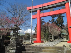 街道に戻り国道138号を横断して20分ほど歩くと街道際に朱鮮やかな鳥居がそびえているが、ここは新橋浅間神社。ちょうどこの時期、鳥居の周囲には紅白の梅が咲き、その後方には銀色に輝く富士が見えている。