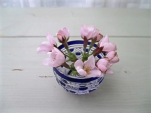 おむかいさんから戴いた一輪のサクラがほぼ満開