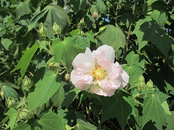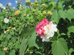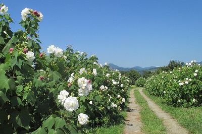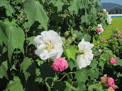 南足柄千津島のふくざわ公園脇農道では、9月中旬から下旬にかけて酔芙蓉の花が見ごろとなる。