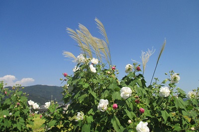 酔芙蓉の花は、朝咲いて夜にはしぼむ1日花で、朝は白く、昼過ぎには淡いピンクに変わり、夕方には濃いピンクに変わる。優美な酔芙蓉の花が咲く農道周辺には、収穫を控えた田圃が広がり、畦道には赤い彼岸花も咲いていて、のどかな秋のひと時をのんびりと楽しめる。