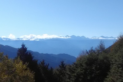 我々も運よくそのアルプスの眺望を目にすることができた。(写真左の乗鞍岳から右に向かって穂高連峰、常念岳、槍ヶ岳)