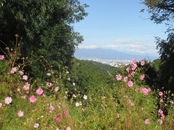 この先、観音山ファミリーパークの方に向かってしばらくは淡々と歩いていく。途中、道端にコスモスが咲いているところがあり、立ち止まってみたら遠くに赤城山が臨めた。