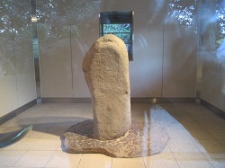 石碑は風化を避けるために覆屋の中で展示されている。(ガラス戸越しのため写真は撮りずらい)