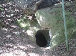 山道を進んでいくと、一時車道に出た後すぐに再び山道に入り、しばらくすると右手に穴大黒(大黒の洞穴)が見えてくる。