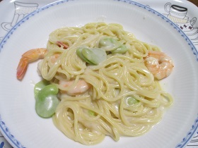 4 3に、コンソメと、塩胡椒をいれて味を調えたら、2で準備している海老とそら豆、茹であがったパスタをいれ、全体を馴染ませて完成。